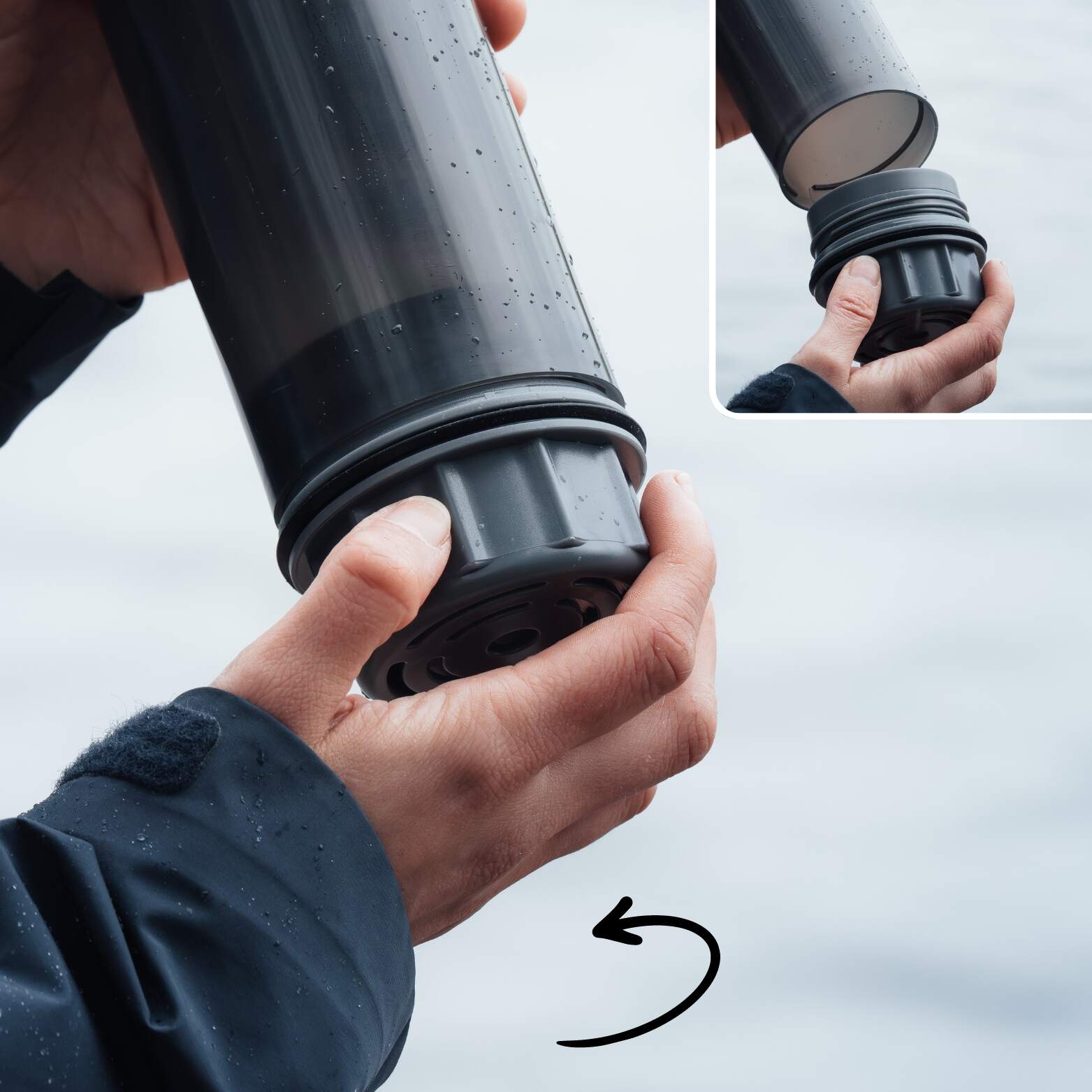 Trenne das Filterelement von der inneren Flasche, indem du es im Uhrzeigersinn abschraubst.